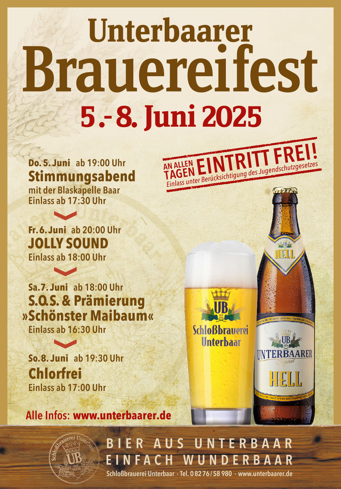 vom 05. Juni bis zum 08. Juni findet 2025 das jährliche Brauereifest in Unterbaar statt: ein Veranstaltungshighlight, für das über 10.000 Gäste erwartet werden.